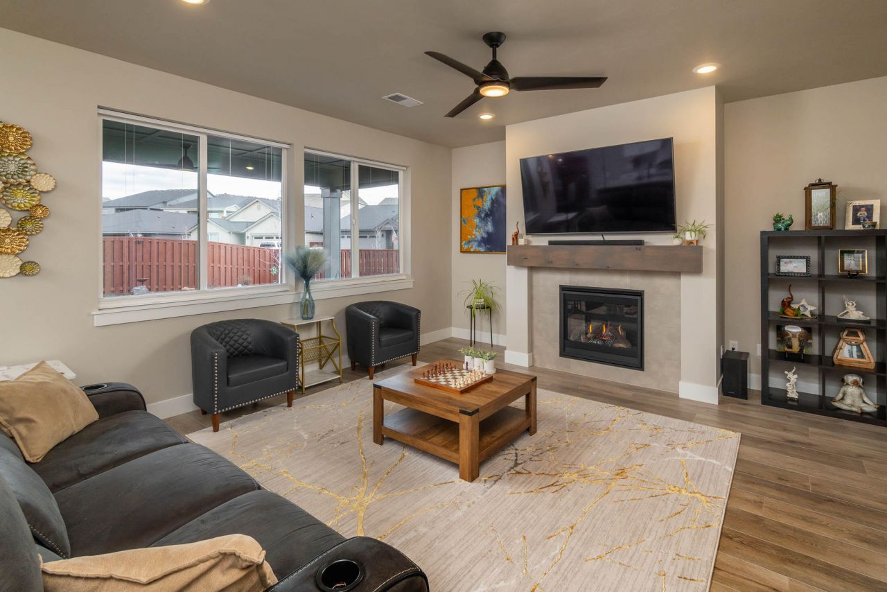 Experience stunning Barnes Butte views from every room on the north side! The inviting great room, complete with a cozy gas fireplace, seamlessly flows into the kitchen featuring a beautiful quartz island, a spacious dining area, and a large covered back patio--perfect for entertaining. Upstairs, unwind in the well-appointed primary suite with a luxurious tile shower and a generous walk-in closet are privately separated from two comfortable guest bedrooms, a full guest bath, a convenient laundry room, and a versatile loft living area offer plenty of space and extended views of the Butte for family and guests. Enjoy meticulously landscaped front and rear yards, plus fencing for added privacy. Community amenities include a seasonal pool, parks, play area, half sports court, and a scenic walking path through a protected wetland reserve with direct access to public walking trails around Barnes Butte. The HOA maintains resort-style amenities including front yard maintenance for easy living.