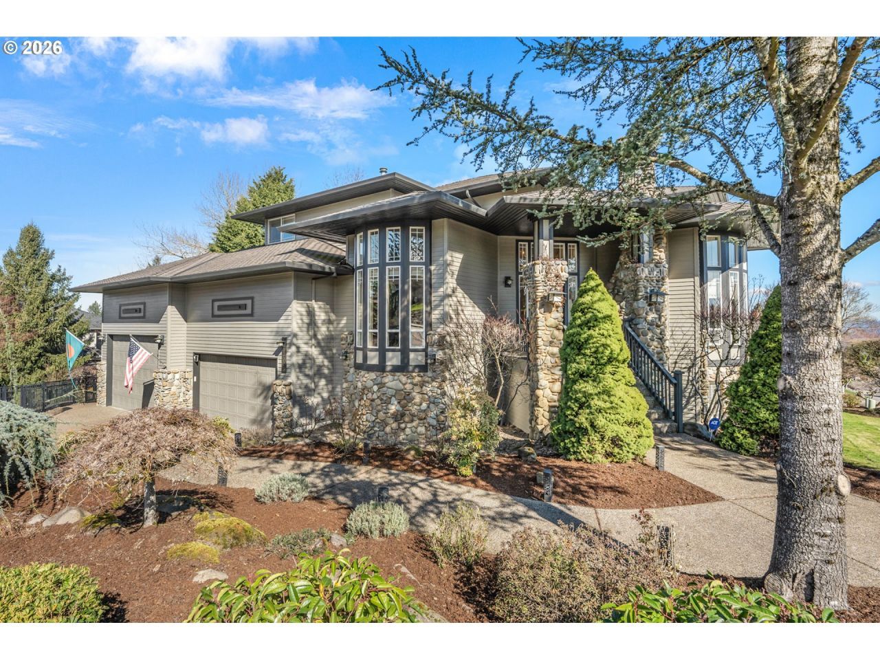 Exceptional Bull Mountain estate offering multi-generational living. Quality construction with soaring ceilings, expansive windows, custom hardwoods, built-ins, and a 4-car garage. Seasonal valley and mountain views, including Mt. Hood and Mt. Adams. Located in a desirable luxury neighborhood. Lower-level apartment features a kitchen, a living room with a fireplace, an oversized bedroom, a full bath, and a ground-level entry. Interior and exterior painted in 2023; updated lighting, newer carpet, roof replaced in 2021, and water heater in 2025. Situated on a spacious 1/3-acre corner lot with room for all.