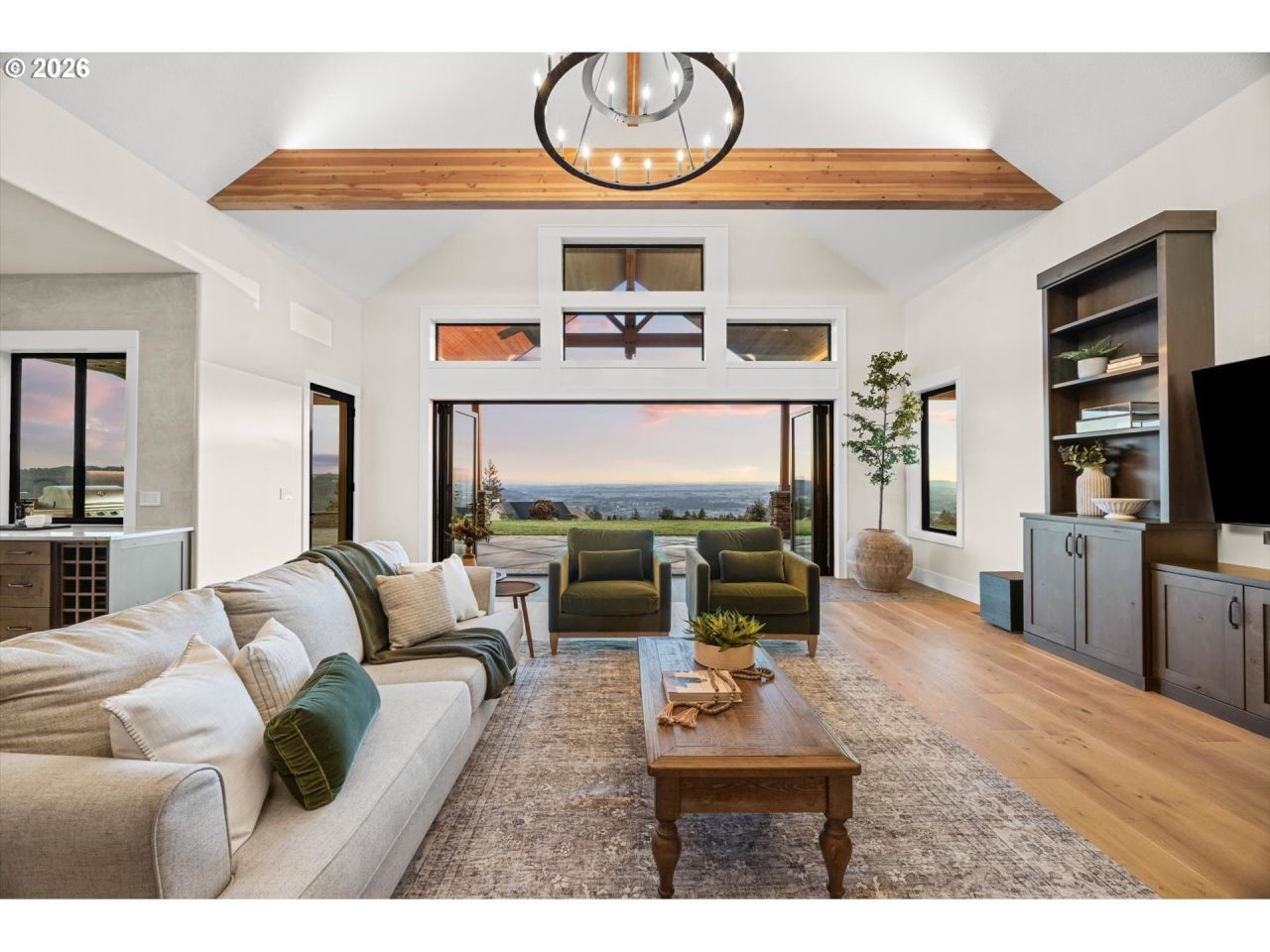 Discover refined living in this exceptional Street of Dreams residence, perfectly positioned on a private 2-acre hilltop in the heart of Yamhill County, the jewel of Oregon's renowned Wine Country. Offering sweeping vineyard, valley, and mountain vistas, this estate delivers an extraordinary sense of privacy, tranquility, and distinction. Designed with both sustainability and sophistication in mind, this certified energy-efficient smart home provides full control from your smartphone, blending modern convenience with timeless elegance. Upon entry, soaring vaulted ceilings, exposed beams, and a striking double-sided fireplace frame panoramic views and create a seamless connection to the surrounding landscape. The open concept culinary kitchen is highlighted by beautiful quartzite countertops and high end GE Monogram Signature Series appliances. The main-level primary suite features heated floors and a luxurious Victoria & Albert soaking tub, offering a true spa-like retreat. The flexible floor plan includes a home office or fifth bedroom, a daylight basement with a theater room, mini bar, additional bedroom and living area and workout space. A private, flexible space above the garage, ideal for guests, multi-purpose living, or extended stays with it's own bedroom and bathroom. Outdoor living is elevated with expansive patios, a fully equipped outdoor kitchen, and sophisticated landscape lighting designed for year-round enjoyment. A three-car garage, RV parking, and a secondary driveway provide exceptional convenience and versatility. Located just minutes from world-class wineries, acclaimed dining, and the best that Newberg has to offer, this estate is a rare blend of design, comfort, and serenity. Experience the pinnacle of Oregon Wine Country living.