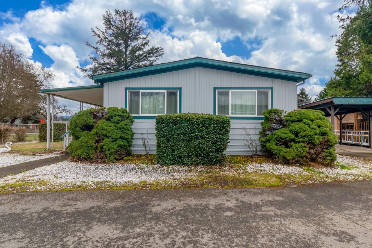 Welcome to Parkview Estates! This is a 55+ community which is located in the heart of Rogue River! This affordable home offers 2 bedrooms and 2 bathrooms. It features both a covered front porch with views of the park across the street and a covered back porch for additional outdoor enjoyment. The property also includes a detached covered carport, providing convenient parking. There is a storage shed with built-in shelving, providing convenient parking and extra storage space. Comfortable, inviting, and move-in ready, this home is ready to welcome its new owner.