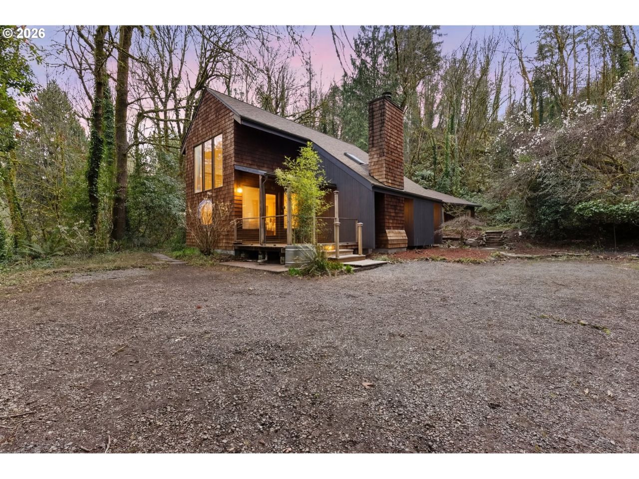 Step into a groovy vibe that feels straight out of a cool Pacific Northwest retreat. Tucked on a private almost acre surrounded by towering trees, this one of a kind loft style home blends vintage character, artistic details, and a laid back lifestyle that feels like vacation every day. Inside, warm wood ceilings, textured walls, and a striking open staircase create a space that feels both architectural and soulful. The dramatic living area features a cozy fireplace framed by natural wood accents, while a bold copper tone statement wall adds a groovy retro touch that sets the tone for the entire home. The flexible loft style layout includes two separate suites, making it ideal for guests, shared living, or creative work from home setups. The kitchen flows easily into the main living spaces and opens to the outdoors, inviting in natural light and forest views. Throughout the home, unique windows and angles create an atmosphere that feels peaceful, creative, and deeply connected to nature. Outside, the possibilities expand even more. A detached studio offers the perfect space for a sauna, meditation room, yoga studio, or private office. An aged greenhouse sits quietly among the trees with beautiful natural patina etched by time and weather, ready to be revived for gardening enthusiasts. A heated detached garage provides room for projects, storage, or hobby space. Set on a full acre of tranquil land, this property feels like a hidden retreat where you can unplug, recharge, and live surrounded by nature while still enjoying the comforts of home. A truly unique property where creativity, privacy, and lifestyle come together to create a place that feels like a year round getaway.