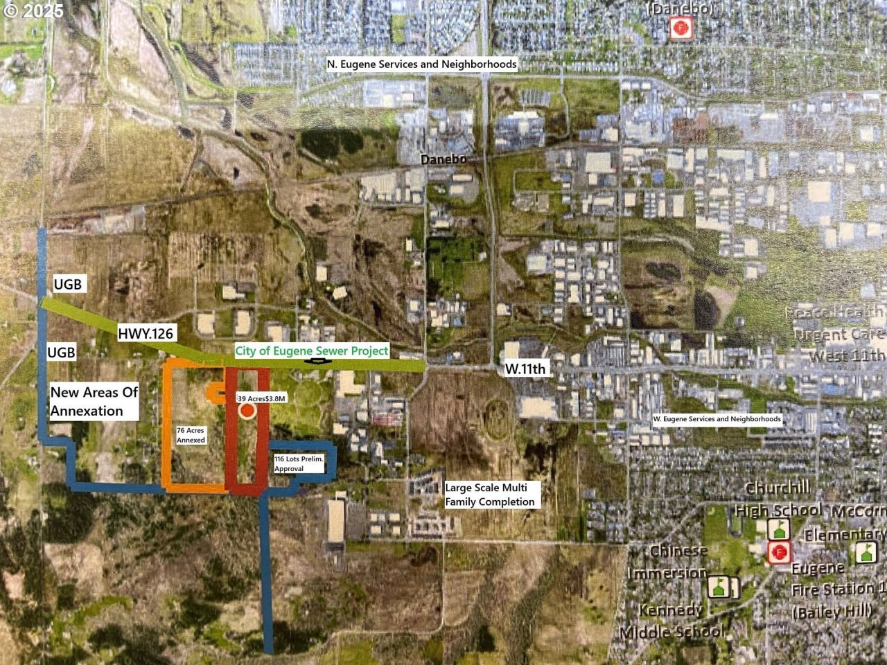 39+ Acres R-1/R-2 Residential Development Ground at the beginning of Eugene's last frontier for massive housing development! City of Eugene annexation, planning and funding for services at and past this property are in process. Adjacent to 116 lot subdivision in Preliminary Approval to the East. Adjacent to already annexed 76 Acres of R-1 to R-2 to the West. Amazing view areas of the Northern Valley and with flat and moderate slope areas conducive to high end single family and multi family sites. The gateway to one of Eugene's singled out areas for a potential new housing boom all the way to the West.