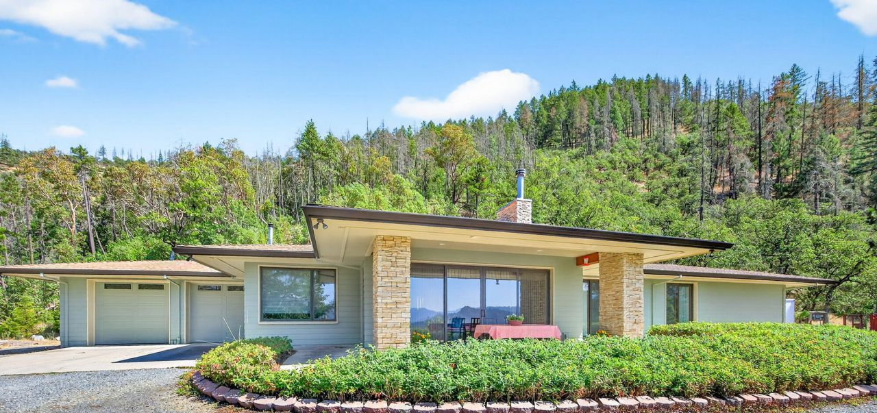 Single-level custom home on acreage showcases dramatic views and architecture. Rare privacy in the midst of nature afforded by 14+ acres backed by BLM land at the end of a quiet country road; yet the home is only minutes to historic Jacksonville and has high-speed cable internet. High-level view overlooking the Applegate Valley and mountains beyond with a different beautiful sunset every night! Home design is inspired by Frank Lloyd Wrights principles, with sleek horizontal lines and a flowing open layout with prominent use of wood, stone, concrete and glass. Spacious high-ceilinged great room with clerestory, stone-finish fireplace and wall of Patio doors. The luxurious primary suite boasts its own panoramic views, patio access, dedicated office, walk-in closet, and spa-like bathroom. Upscale features include zoned radiant heated floors, extensive cherry wood cabinetry, abundant storage, quality Pella windows, oversized garage, 400-amp electrical service, laundry room with shower.