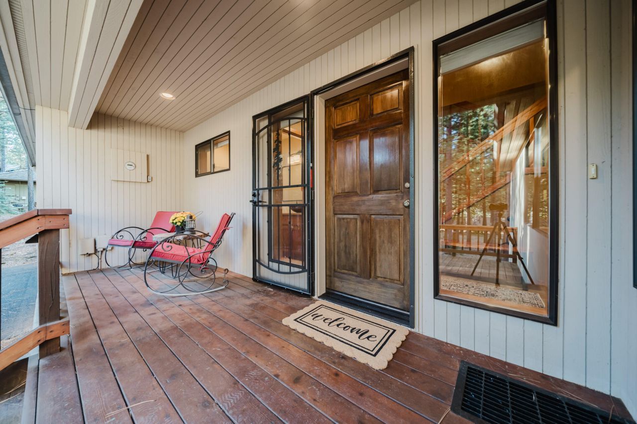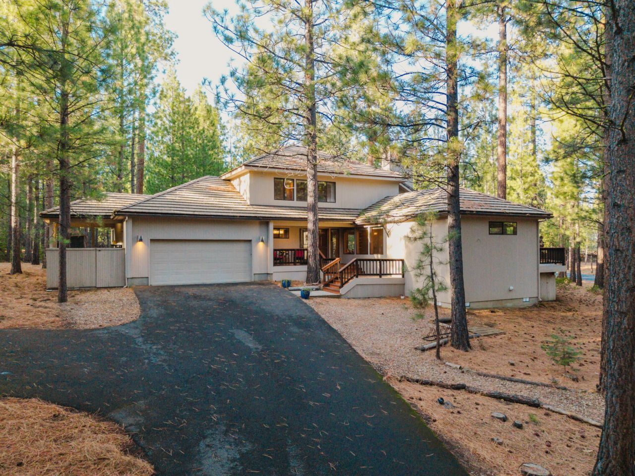 A peaceful, serene retreat on the Ranch perimeter, this lovingly updated home features a versatile, light-filled floor plan and design. Tucked away on lightly traveled roads and bordering common land, it offers quiet seclusion while just a short stroll from a Ranch pool and amenities. Expansive windows create a seamless indoor-outdoor connection. The vaulted living room, with grand floor-to-ceiling slate fireplace and wood-burning insert, invites cozy gatherings, while the kitchen with stainless steel appliances, rosewood island with induction cooktop, quartz counters, wet bar, and breakfast bar is perfect for entertaining. Two guest bedrooms down a window lined hallway open to the main deck, and a bonus room provides flexible space. Upstairs, a private owners suite with deck and a versatile library/office overlooks the living room and tree-filled views. Updated baths, heat pump, tile roof, double garage, and ample storage make it move-in ready for enjoying Black Butte Ranch living.