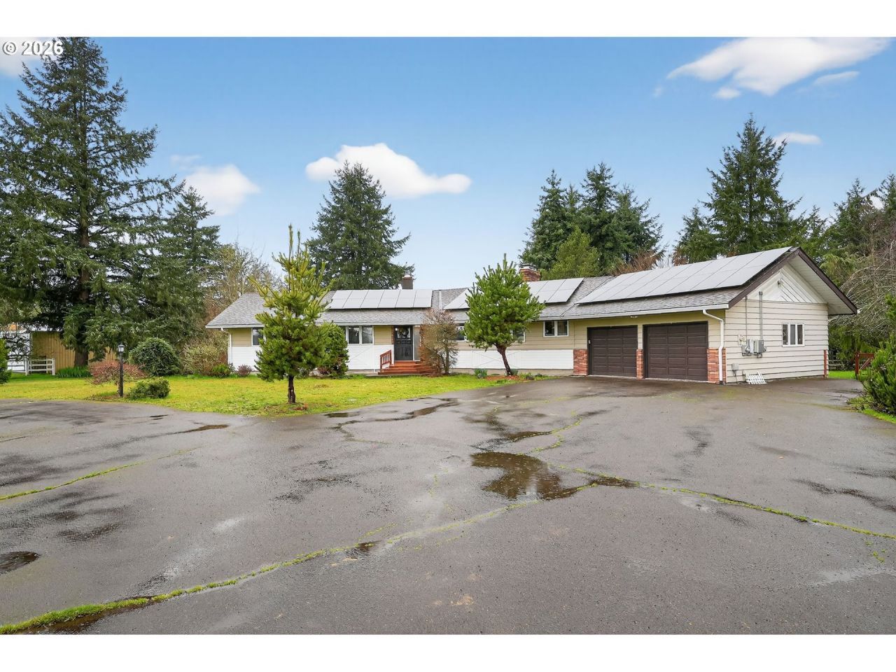 Spacious country property on 1.31 acres just outside Sheridan offering over 4,500 sq ft of living space across two levels. The main floor includes living and dining rooms, a kitchen open to the family room with fireplace, and three bedrooms including the primary suite. The finished lower level features a large L-shaped recreation room with fireplace, billiards area, and bar-ideal for entertaining or flexible living. Two additional finished rooms downstairs offer options for office, hobby, or additional bedrooms (non-conforming), along with a large L-shaped storage room (approx. 23' x 23') providing substantial storage. Three wood-burning fireplaces add warmth and character throughout the home.The 1.31-acre property includes a fenced backyard with Trex deck, chicken coop, greenhouse, & fire pit area in the side yard near the shop. Fruit trees and berries include apple, plum, pear, blueberries, raspberries, marionberries, and elderberries. A detached 24' x 36' shop with concrete floor and electricity provides excellent workspace and ample nearby parking, in addition to the attached two-car garage. Solar panels and a partial-house generator hookup add practical utility to this well-rounded rural property.